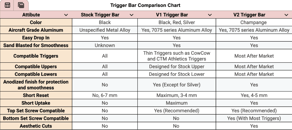 The primary difference between the V1 and the V2, aside from aesthetics, is the shape of the trigger bar. The areas that engage with the disconnector and other parts in the hammer group are reshaped to allow for more compatibility with thicker aftermarket triggers like theTTI Victor Trigger or even the stock trigger.